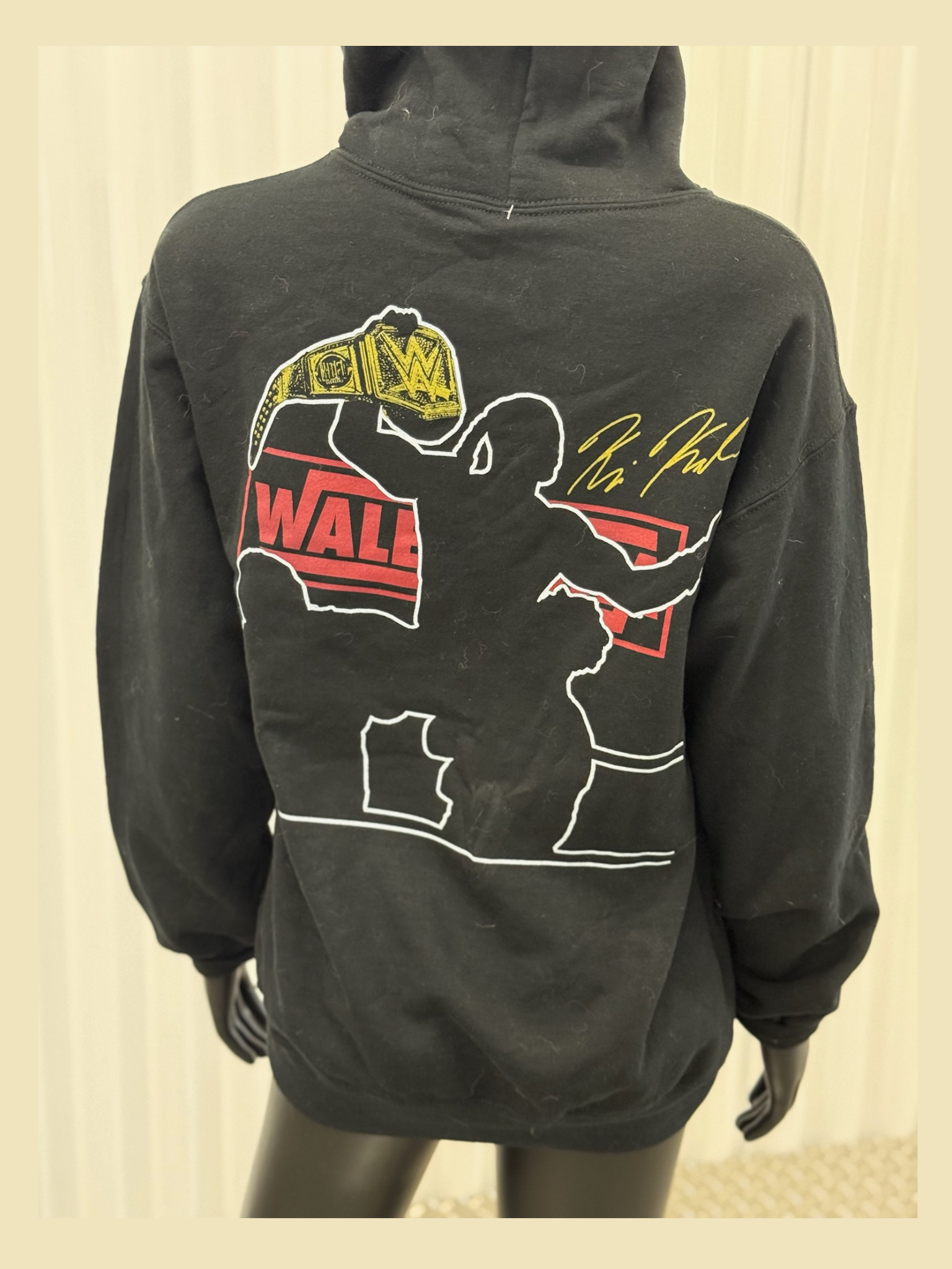 Hoodie depicting Kofi Kingston from the WaleMania collection, designed by hip-hop star Wale in collaboration with FootLocker to honor WWE’s black world champions. The release coincided with WrestleMania 37 in Tampa, Florida. April 2021 https://www.theblotsays.com/2021/04/wwe-walemania-t-shirt-collection-by.html